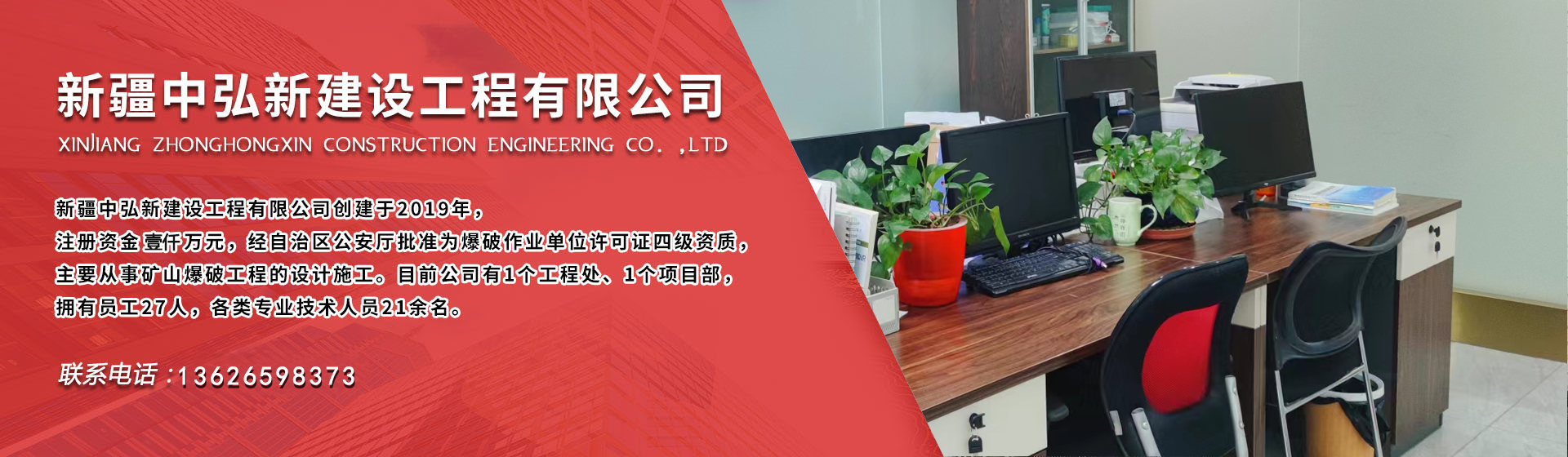 ZHONGHONGXIN CONSTRUCTION ENGINEERING 公 司 簡 介新疆中弘新建設(shè)工程有限公司創(chuàng)建于2019年,注冊資金壹仟萬元,經(jīng)自治區(qū)公安廳批準(zhǔn)為爆破作業(yè)單位許可證四級資質(zhì),主要從事礦山爆破工程的設(shè)計(jì)施工、礦上采掘施工業(yè)務(wù)。目前公司有1個工程處、2個項(xiàng)目部,分...